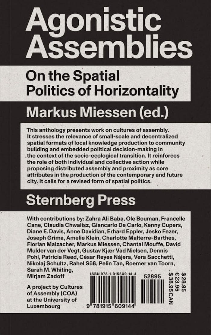 ‘Let’s begin, in nearness!’. Zo klinkt het startschot waarmee Markus Miessen zijn jongste werk, over de nood aan een kritische, gepolitiseerde en vooral gedecentraliseerde architectuur, inleidt. Agonistic Assemblies: On the Spatial Politics of Horizontality, zo luidt de titel, is een lijvige anthologie – een toolbox, zoals Miessen het zelf noemt – met het doel de democratie from the bottom up, in de marges van haar institutionele geraamte en, nog het meest van al, op het lokale of zelfs intieme niveau te heroverwegen in termen van ruimte, design en architectuur. Want, zoveel is duidelijk: architectuur is niet enkel een uitdrukking van een politieke cultuur – architectuur vormt die cultuur ook. Wie de architectuur verandert, zo leren we uit het boek, verandert daarmee onvermijdelijk de machtsstructuren. Het komt er dan ook op aan architectuur en design kritisch in te zetten in ons denken over en de vormgeving van onze huidige democratie.