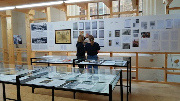 Voor het vijfde evenement organiseerden we een Holistic Reading Room, waarbij we in groep voorlazen uit het boek van de Italiaanse filosoof Giorgio Agamben over de wet van het samenleven: The Highest Poverty: Monastic Rules and Form-of-Life, onderbroken door korte meditatiepauzes die ik begeleidde. We keken naar de eerste bewoners van het gebouw, de monniken. Het blijkt dat de monniken, toen ze daar woonden, na de Franse Revolutie problemen kregen met onroerend goed. Dus ze had plannen bedacht om delen van het gebouw aan verschillende eigenaars te verkopen, en ook toen al was er een projectontwikkelaar die brieven naar hen stuurde. Dit vonden we terug in het archief, samen met adviezen over hoe ze het gebouw in kavels konden verdelen. Voor die tijd beschouwden ze zichzelf niet als eigenaars, de grond was enkel voor gemeenschappelijk gebruik bestemd omdat het van God was. In de afgelopen twaalf maanden hebben we veel intrigerende historische informatie aangetroffen dat zich momenteel in het archief bevindt dat ik boven in de Kunsthal Gent heb ingericht. Het bestrijkt de geschiedenis van het gebouw vanaf de 13de eeuw tot vandaag. Het bevat niet alleen historische brieven, kaarten en teksten, maar ook krantenknipsels vanaf de jaren ‘70, mijn e-mailverkeer met alle betrokken partijen tijdens dit project, en zo meer.