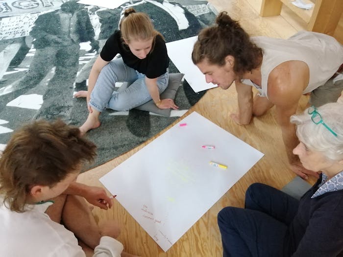 GN: Ik heb samengewerkt met Jubilee, omdat zij in hun project Caveat bezig zijn met juridische contracten. Ik heb het hele project ontworpen als een soort ‘seizoen’, ik noemde het een Season of Truth and Reconciliation. Het gaat niet alleen over het gebouw, maar ook over de vroegere en de huidige bewoners. Sinds januari hebben juriste Julie [Van Elslande, PV] en ik onderzoek gedaan naar de geschiedenis van het gebouw en de huidige situatie. We hebben maandenlang getelefoneerd met de stad, de provincie, de dekenij, WoninGent, Fernand Huts en anderen die belang hebben bij de site. Uiteindelijk konden we Miss Miyagi spreken [een ontwerpteam voor vastgoedontwikkeling, ingehuurd door SOgent - stadsontwikkelingsbedrijf Gent, PV], die gevraagd waren om ontwerpvoorstellen te doen. We hadden het geluk dat we Miss Miyagi in februari konden spreken, zodat we sommige voorstellen eerder te zien kregen dan anderen; sommige daarvan waren om van Het Pand een hotel en een conferentiezaal te maken. Het was een vreemde situatie om in te verkeren, omdat ze duidelijk ons advies vroegen maar wij ons tegelijk afvroegen waarom deze informatie niet openbaar werd gemaakt. Parallel hieraan en onbekend voor ons was er een groep jonge kunstenaars, de ‘Pandemisten’, die besloten het gebouw te kraken. Dat veranderde het project in termen van aandacht, want van zodra de Pandemisten het gebouw introkken bracht dat veel pers met zich mee. Maar we hebben altijd een onderscheid gemaakt. We hebben altijd duidelijk gemaakt dat we geen Pandemisten waren. Met dit project wilde ik een meer neutrale partij zijn in het hele debat, omdat ik geïnteresseerd ben in de kwestie van verzoening. Over mijn eigen familiegeschiedenis gesproken: mijn moeder was een activiste. Ik groeide op door naar demonstraties te gaan, anti-apartheid, pro-multicultureel, enzovoort. Mijn moeder ging Truth and Reconciliation studeren toen ik 10 was. Omdat ik echt geloof in die manier van werken heb ik een programma ontworpen dat verschillende elementen in zich draagt. Mijn doel was niet om alleen een publiek debat te houden – het publieke debat vindt zelfs plaats aan het einde van het project. In plaats daarvan begon ik met A Therapeutic Townhall Meeting, om verschillende belanghebbende partijen bij elkaar te brengen: de dekenij, de Pandemisten, Miss Miyagi, mensen van de provincie en uiteraard ook het brede publiek. Het ging daarbij niet zozeer om debat, dan wel om een andere blik op de kwestie. We zaten op een tapijt uit een nieuwe reeks van kunstwerken uit textiel die ik Protest Carpets noem, en die door evenementen kunnen worden geactiveerd. Op dit evenement begeleidde ik de deelnemers bij verschillende bonding exercises zoals meditatie en woordspelletjes, maar ook het schrijven van liefdesbrieven aan de vijand. Zo zouden de Pandemisten bijvoorbeeld liefdesbrieven schrijven aan de vastgoedontwikkelaar. Door dit te doen zag je pas hoe moeilijk het is om iets positiefs te schrijven aan iemand waarvan je denkt dat die ideologisch anders is dan jij. Het was een zeer krachtige oefening in gemeenschapsvorming, met verschillende mensen van verschillende leeftijden, en een geweldige manier om het project te beginnen.