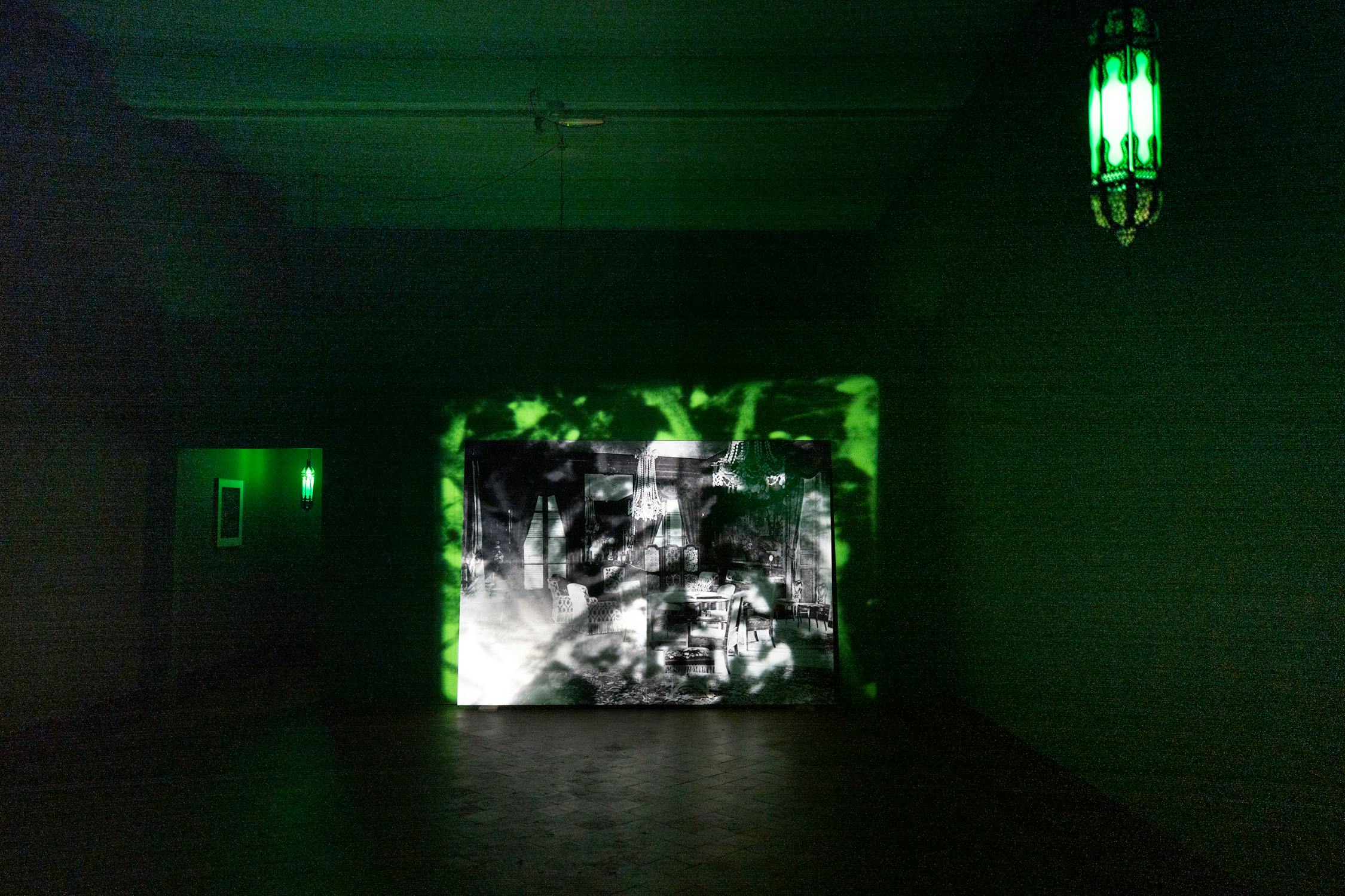 JK: Van de clublocatie bestaat geen foto. Ik vond een gedetailleerde beschrijving en iemand hielp me om in de archieven van Parijs een foto uit dezelfde tijd te zoeken die ermee overeenkomt. De film is die foto met eroverheen geprojecteerde cannabisbladeren, als een vreemd manuscript. Perzische lampen en groen licht evoceren de sfeer van de club, waar de leden oosterse kleding droegen. Ik denk dat ze erg geïnspireerd waren door de mythe van de ‘hashshashin’. Volgens deze mythe van Marco Polo liet de middeleeuwse krijgsheer Hassan-i Sabbah in Iran zijn discipelen onder invloed van hasjiesj ontwaken in zijn tuin om hen het paradijs te tonen na de dood. Daarna gaf hij hen hasjiesj om ten strijde te trekken. Zijn hoofdkwartier, de burcht Alamoet, heb ik in 2009 gefotografeerd. Het woord ‘assassin’ komt van ‘hashshashin’. De kunstenaars en schrijvers van de hasjiesjclub wilden de burgerlijke esthetiek vermoorden, denk ik. Daar ontkiemde volgens mij het idee dat kunst maken onder invloed een subversieve act is. Vooral in rock-’n-roll en de muziek is de connectie tussen drugs en subversieve kunst niet weg te denken.