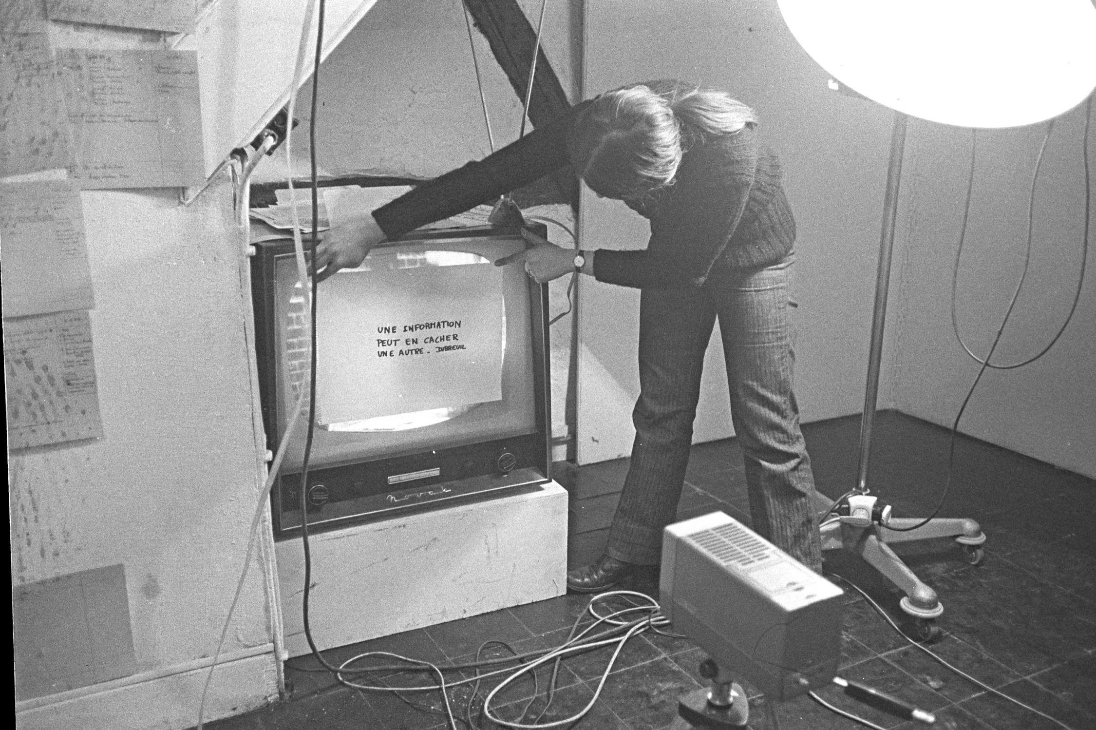DD: Er ontstaan enkele belangrijke polen rondom plekken en organisaties waar productiemiddelen te vinden zijn. Het ICC in Antwerpen beschikte over een aantal camera’s die ze uitleenden, en ook rondom het RTC, de televisiezender in Luik, ontstond een kring kunstenaars die met video begon te experimenteren. Toch bleek ook bijvoorbeeld New Reform Gallery in Aalst een rol te spelen: daar werd veel video geprogrammeerd en samengewerkt met een lokaal elektronicabedrijf voor de huur van materiaal. Het was plantrekkerij, roeien met de riemen die er waren. Dat zit zeker in de tijdsgeest ingebakken. Er was een veel minder uitgebreid subsidiesysteem en veel kunstenaars en organisaties waren louter op zichzelf aangewezen. Dat zorgde voor veel spontaniteit en samenwerking. Er werd minder tijd besteed aan de conceptualisering van projecten, veel dingen gebeurden gewoon. Eigenlijk zie je dat nu nog steeds, maar misschien zijn dat soort momenten minder zichtbaar. Opvallend: het is ook in de jaren 1970 dat de bevoegdheid cultuur voor het eerst opgesplitst werd tussen Vlaanderen en Wallonië. Er was toen meer interactie tussen onze twee landsdelen, iets dat later stilaan verdwijnt.