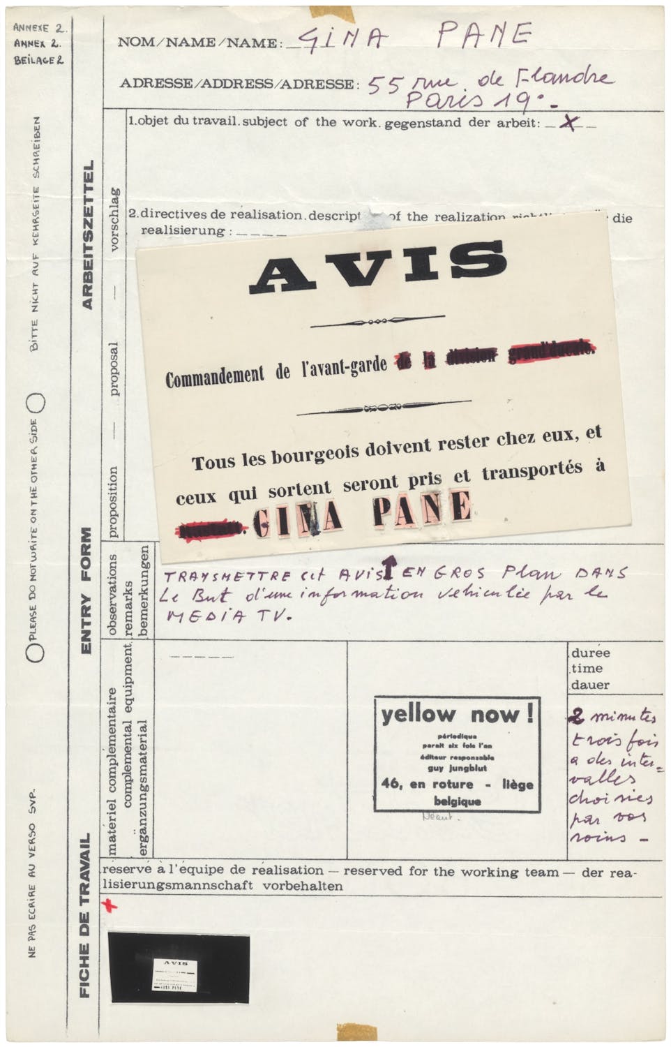 DD: In andere landen werd al veel langer met film en video geëxperimenteerd. Denk maar aan Duitsland of de Verenigde Staten. ‘La Belgique, toujours en retard’… In de jaren 1970 werd de wereld stilaan kleiner. Vliegen werd goedkoper en het werd vanzelfsprekender om in contact te staan met buitenlandse kennissen. Druppelsgewijs sijpelden via het buitenland nieuwigheden binnen. Flor Bex, toen spil van het ICC, haalde eigenhandig filmmateriaal naar Antwerpen vanuit Argentinië, waar hij een goed contact had met Jorge Glusberg en het Centro de Arte y Comunicación. Daarna kocht hij ook andere camera’s aan, maar kon die aanvankelijk niet als onkosten aangeven, omdat hij wist dat de administratie hier geen voorstander van zou zijn. Hij boekte ze in als meubilair.